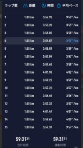 風速4mの中、3’55~4’05/kmを設定とし、その中で走り切ることができたので一安心です。