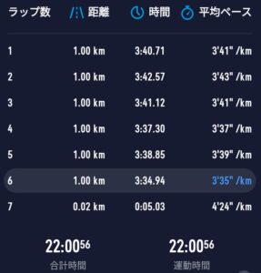 途中からペースを上げてしまうところはまだまだですが、6kmは走り切れたのでOK