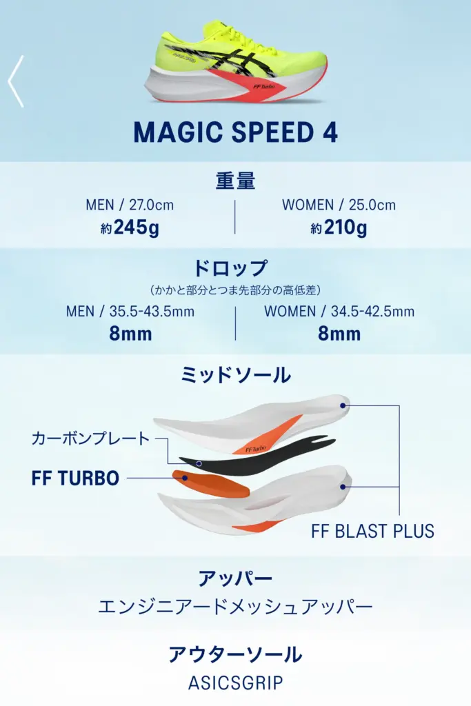 マジックスピード4(アシックス) 徹底レビュー アシックスの厚底ランニングシューズ『マジックスピード4』をレビュー致します。 2023年9月に発売されたマジックスピード3から、約10ヶ月での販売(一般店舗の販売は2024...
